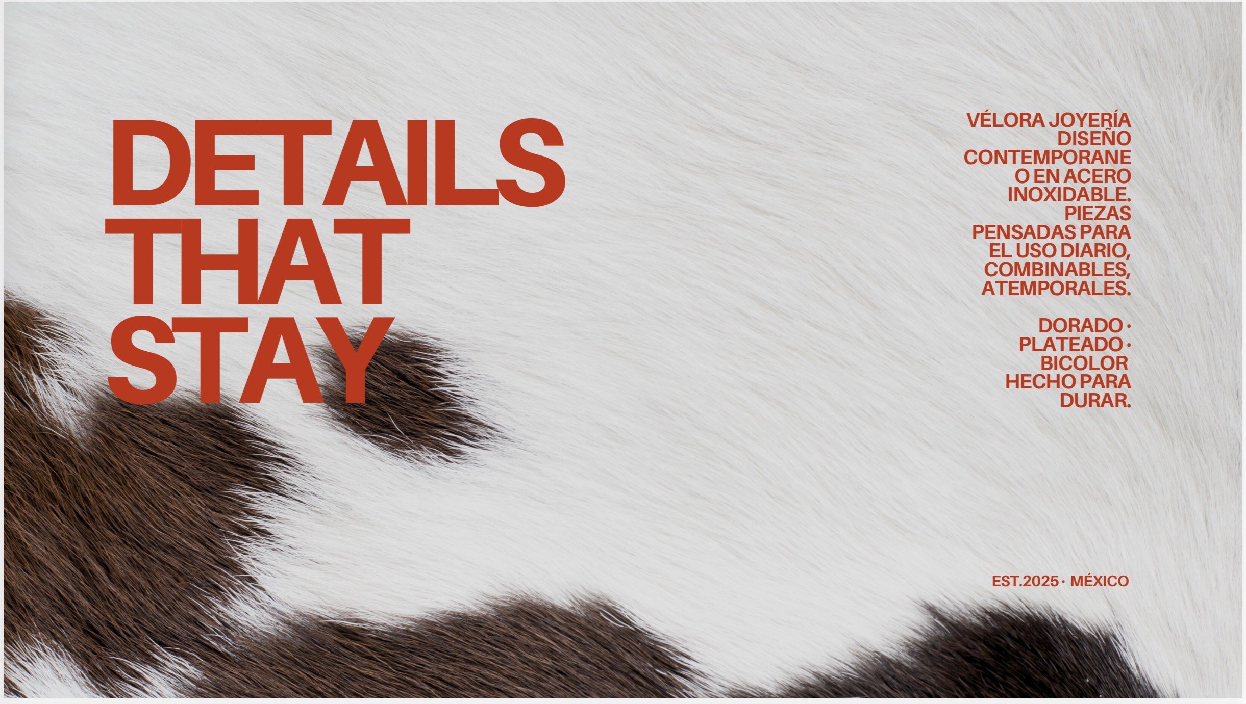YOUR SHINE. YOUR STORY. no sigas tendencias, créalas. Favoritos del momento Vista rápida Earcuff Lua $280.00 Color: Seleccionar Color Plateado Dorado Agregar al carrito Más sobre nuestra marca En Vélora Joyería, creemos que la elegancia está en ser tú misma.Creamos una selección de joyas contemporáneas que celebran la autenticidad y el estilo único de cada mujer — porque no hay una sola forma de brillar, hay una para cada mujer Vélora. Síguenos en las redes sociales Redes sociales Suscríbete Sé parte del universo Vélora.Inspírate, descubre y brilla con nosotras.Al suscribirte, recibirás novedades, lanzamientos exclusivos y consejos de estilo diseñados para acompañarte en cada momento. Nombre Apellido Correo electrónico Registrarse ¡Gracias!